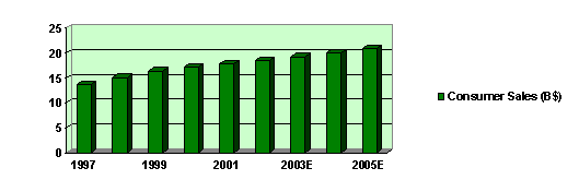 Estimated at $18.5 billion in 2002, dietary supplement sales accounted for approximately 9% of the U.S. health care products market (defined as pharmaceutical drugs, over-the-counter healthcare products and dietary supplements); according to new research by San Diego-based Nutrition Business Journal. The condition-specific supplement segment of the total dietary supplement market is B$9.