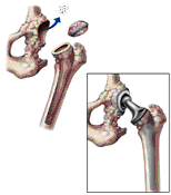 is replaced by a metal ball attached to a metal stem fitted into the femur, and a plastic socket is implanted into the pelvis, replacing the damaged socket.